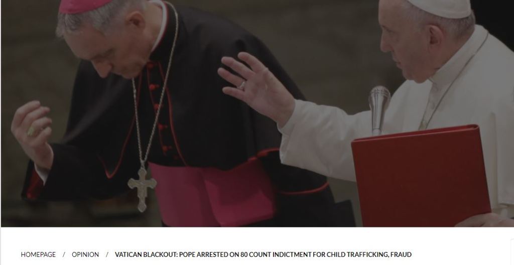 Vatican Rumors 1/10/21 An article by Carlos James https://www.conservativebeaver.com/2021/01/10/vatican-blackout-pope-arrested-on-80-count-indictment-for-child-trafficking-fraud/ Share this:TweetLike Loading... Related