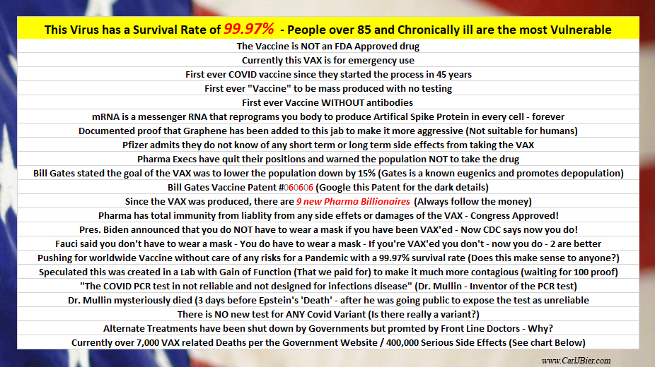 VAX Facts An article by Carlos James All the facts listed can be found on http://www.CarlJBier.com http://www.CarlJBier.com https://vaers.hhs.gov/ Share this:TweetLike Loading... Related