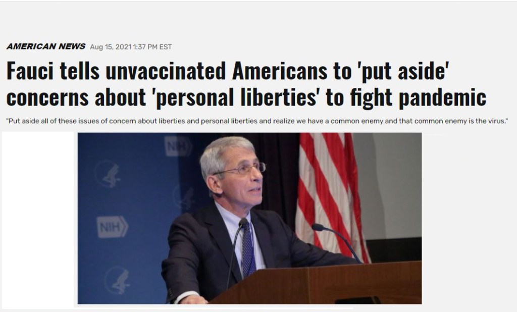 Give up your Freedom for the Greater Good. Sound Familiar? An article by Carlos James https://thepostmillennial.com/fauci-put-aside-personal-liberties?utm_campaign=64474 Share this:TweetLike Loading... Related