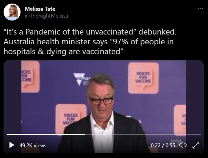 VAX – Debunked!!! 97% of people hospitalized are Vax’ed An article by Carlos James “It’s a Pandemic of the unvaccinated” debunked. Australia health minister says “97% of people in hospitals & dying are vaccinated” pic.twitter.com/IvVYF94RSL— Melissa Tate (@TheRightMelissa) October 1, 2021 https://twitter.com/i/status/1443934281521369094 Share this:TweetLike Loading... Related