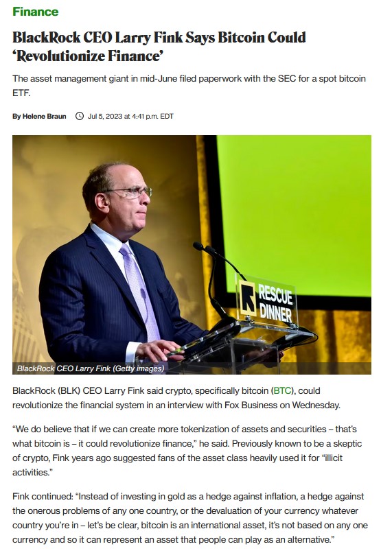 Two years ago, Larry Fink, CEO of Blackrock, the worlds largest Investment Company, called Bitcoin trash and just a vehicle for money laundering. Today, he sees Bitcoin a way to Revolutionize Finance. We’re about to see a tectonic shift and full adoption of crypto currencies and Bitcoin. There are only 21 Million Bitcoin and once Blackrock gets approval for their ETF, we expect Bitcoin to start is move up and over $1Million per per BTC. Smart money is getting in now, before full adoption. In April 2024, Bitcoin will experience the next halving, which will create more scarcity.